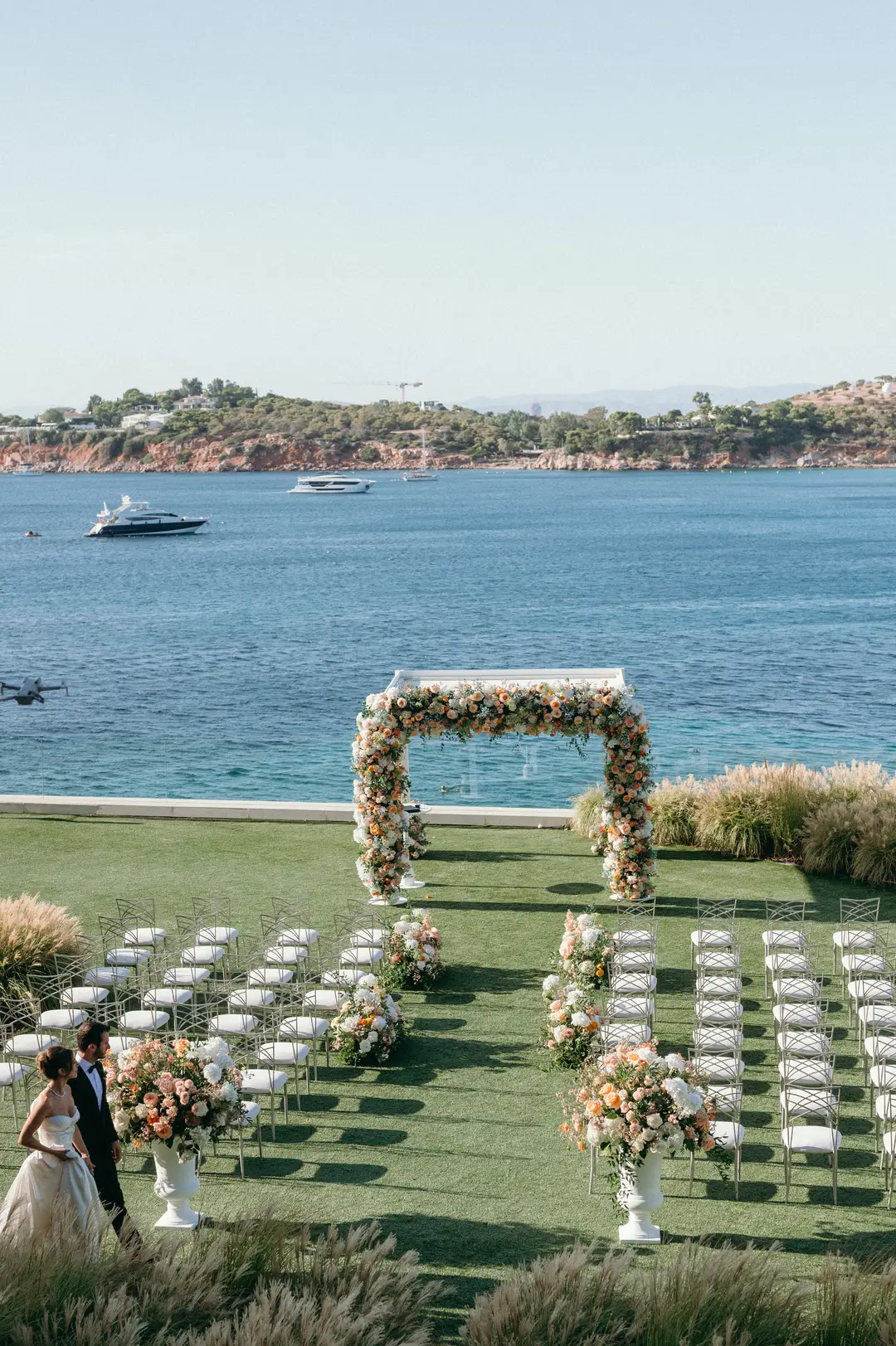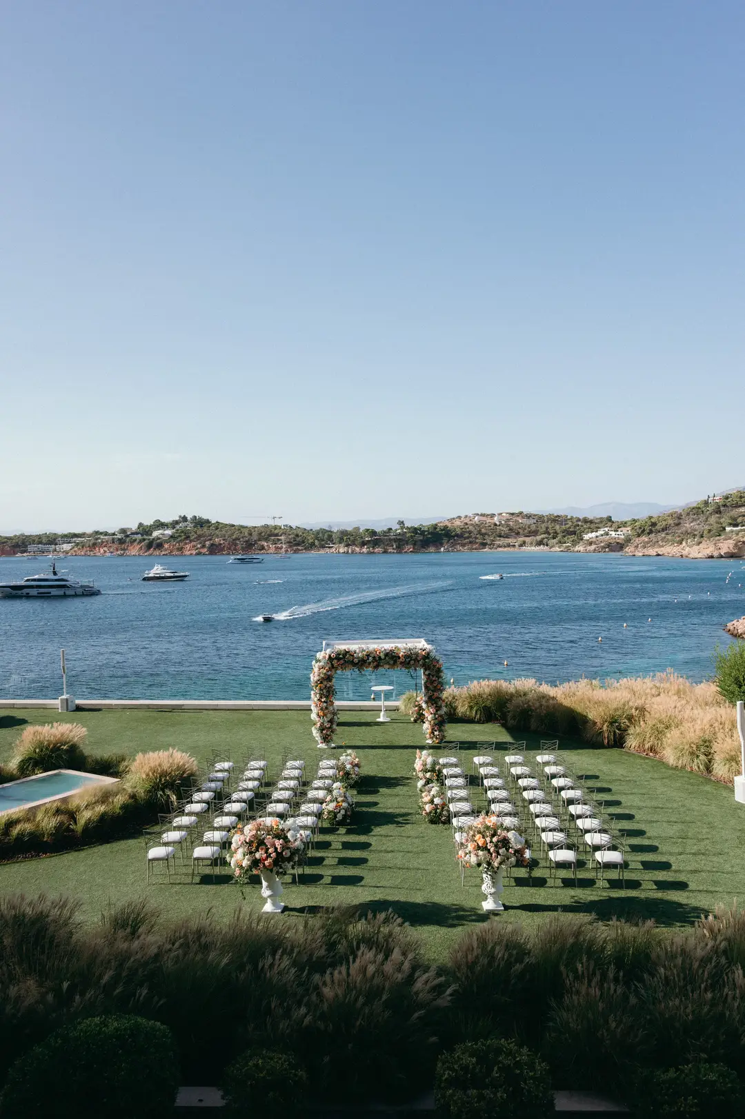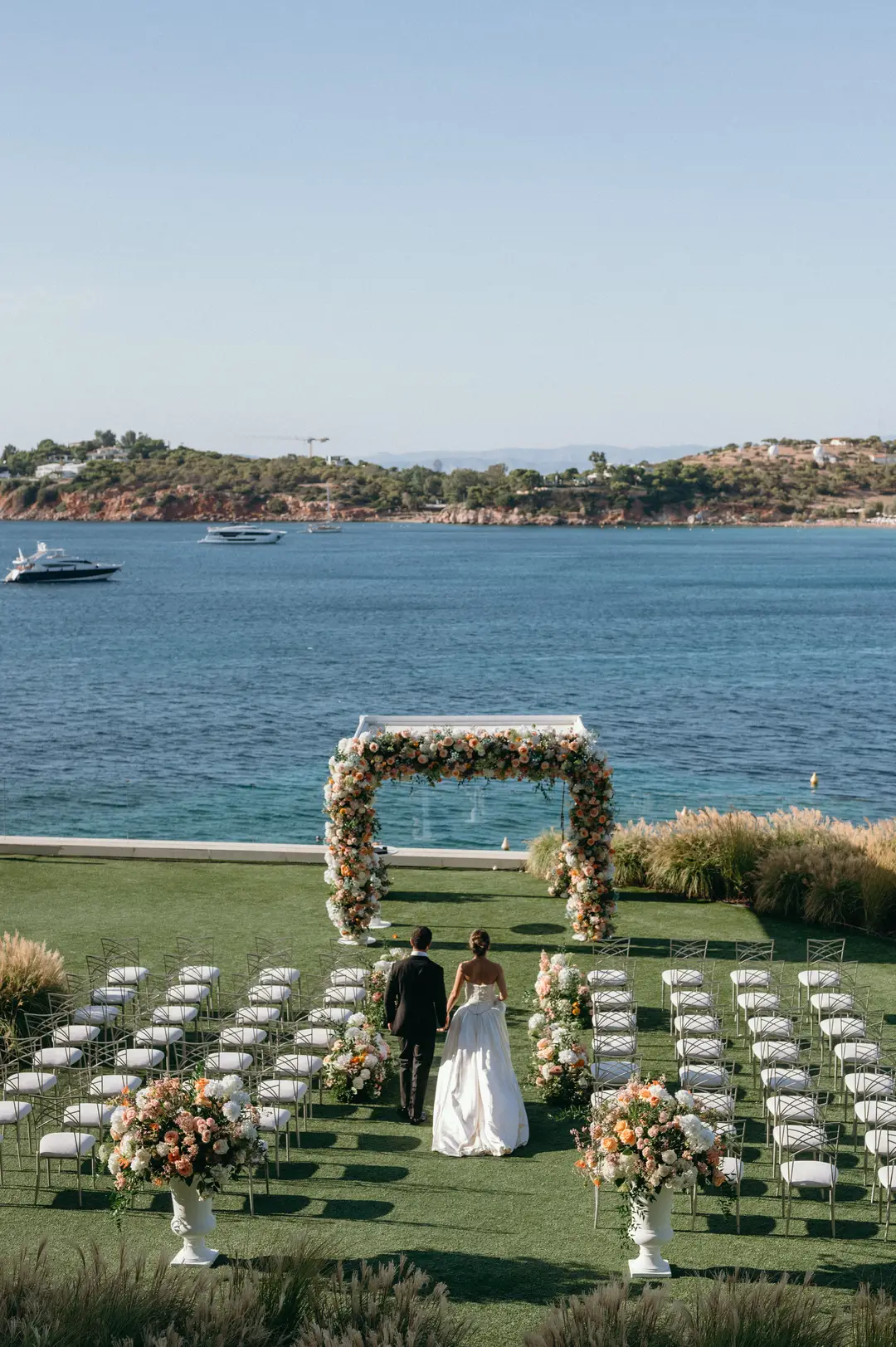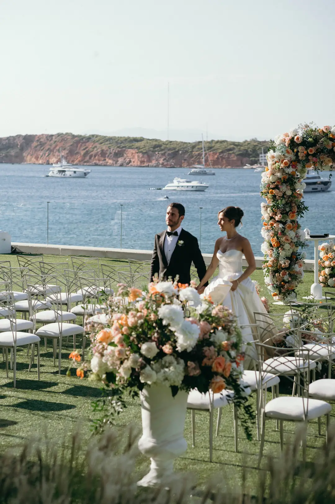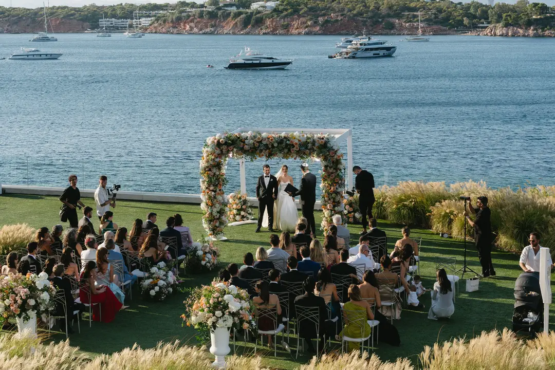 Set at the Living Room Terrace of Four Seasons Astir Palace, this intimate Jewish wedding on the Athenian Riviera was designed for destination guests traveling from the United States. The couple envisioned a celebration defined by Mediterranean sea views and the timeless elegance of Four Seasons Astir Palace , where contemporary luxury meets the natural beauty of the Riviera. Overlooking the water, the atmosphere felt refined yet relaxed, complemented by a pre-wedding gathering at a Four Seasons seaside taverna set just by the waves.