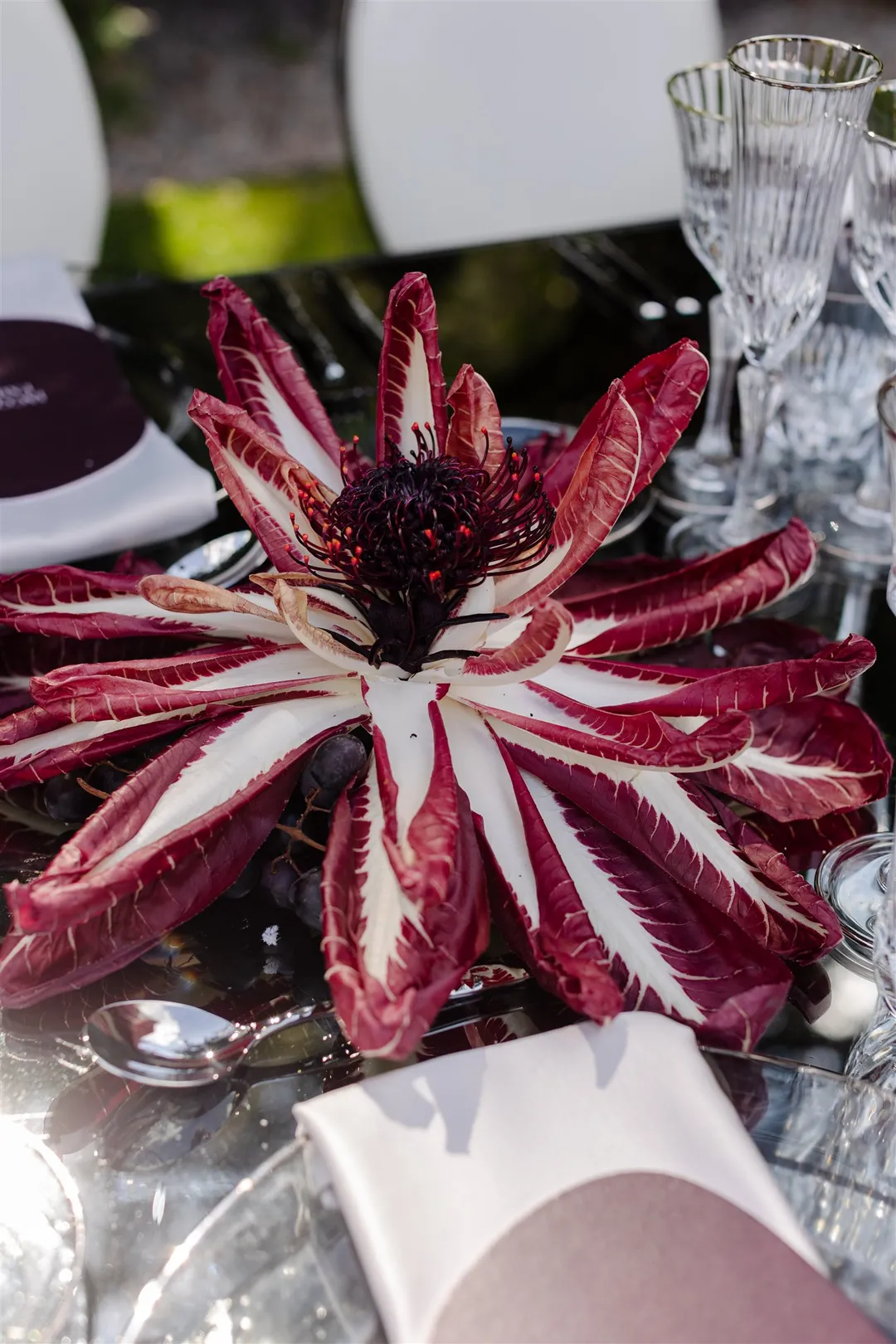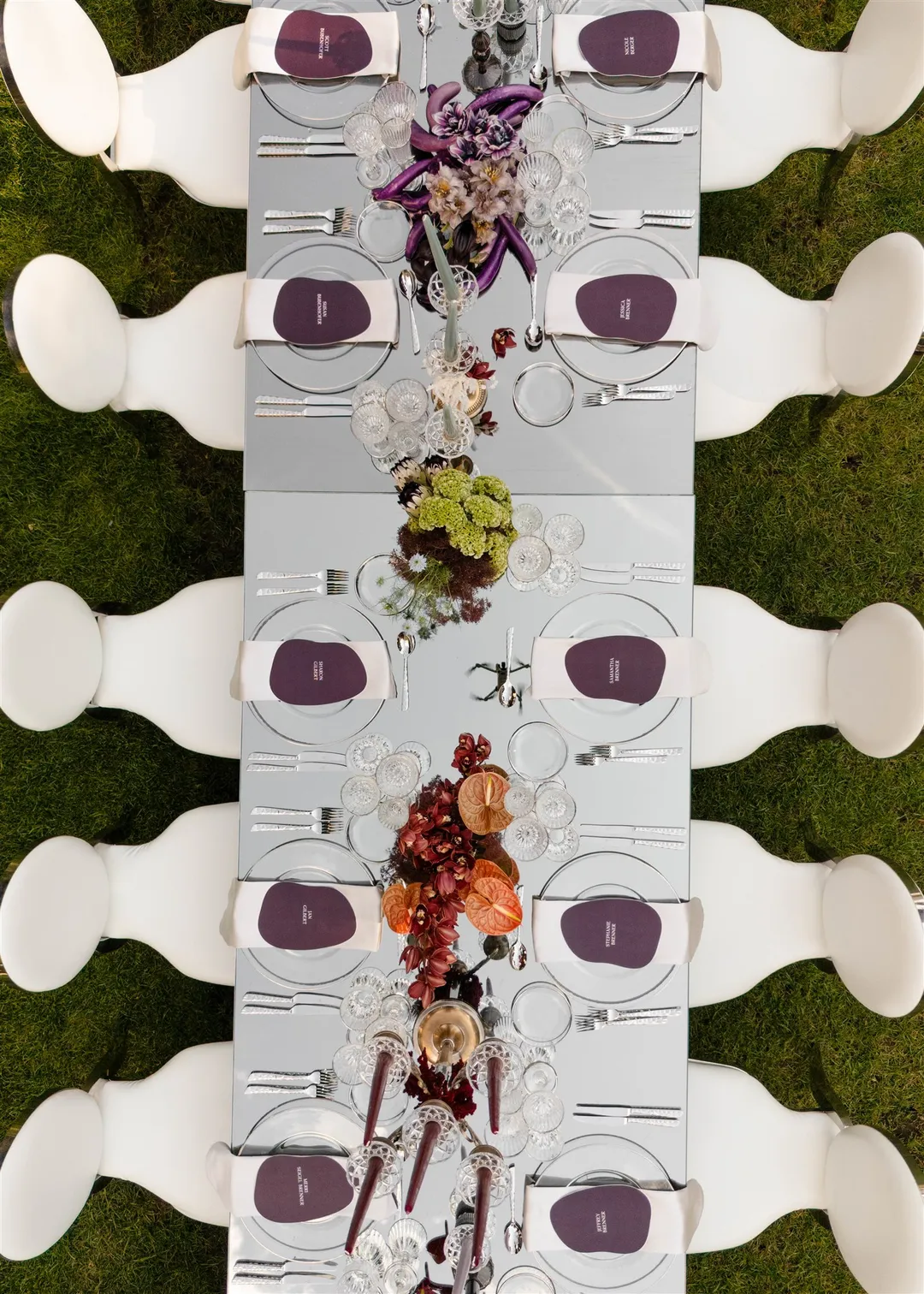 the enchanting gardens. Burgundy, electric greens, and deep blues paired with vintage crystal and