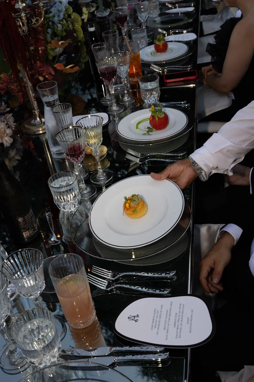 guests’ names and black and white dishes, reflecting the couple’s refined taste and the elegant